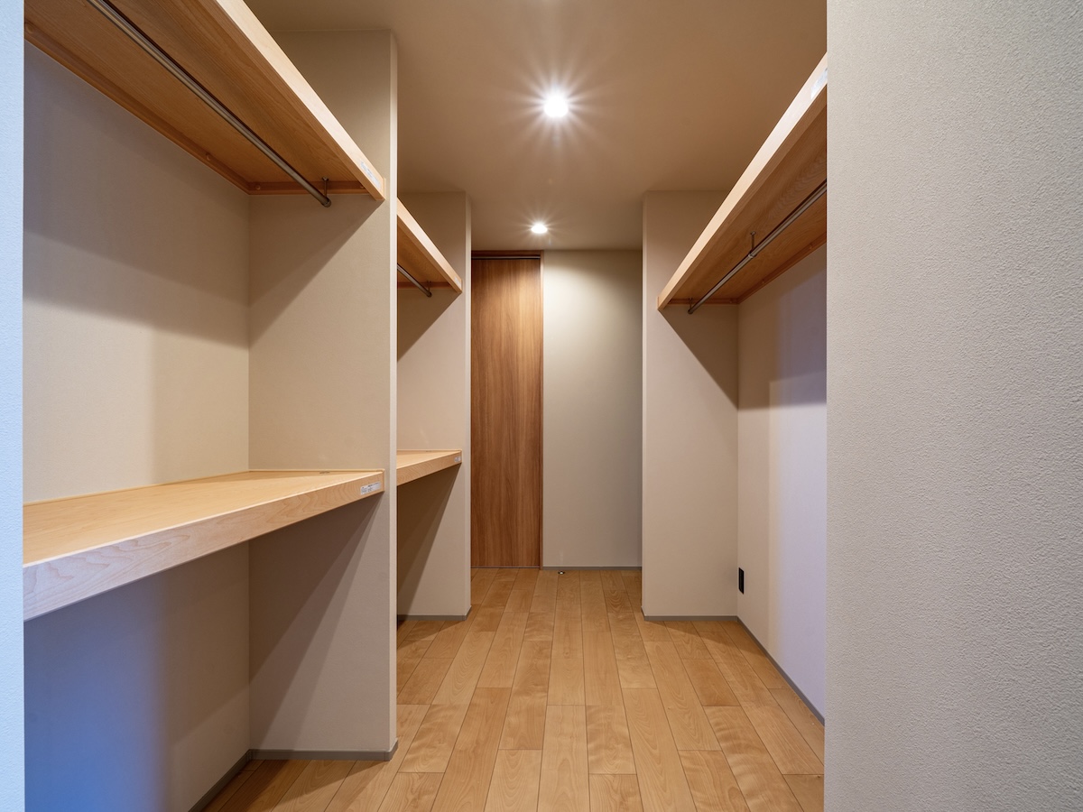 玄関からリビングに向かう途中に、この大きなウォークインクローゼットをまとめて配置してもらい、帰宅してからの片付けが驚くほどラクになりました。